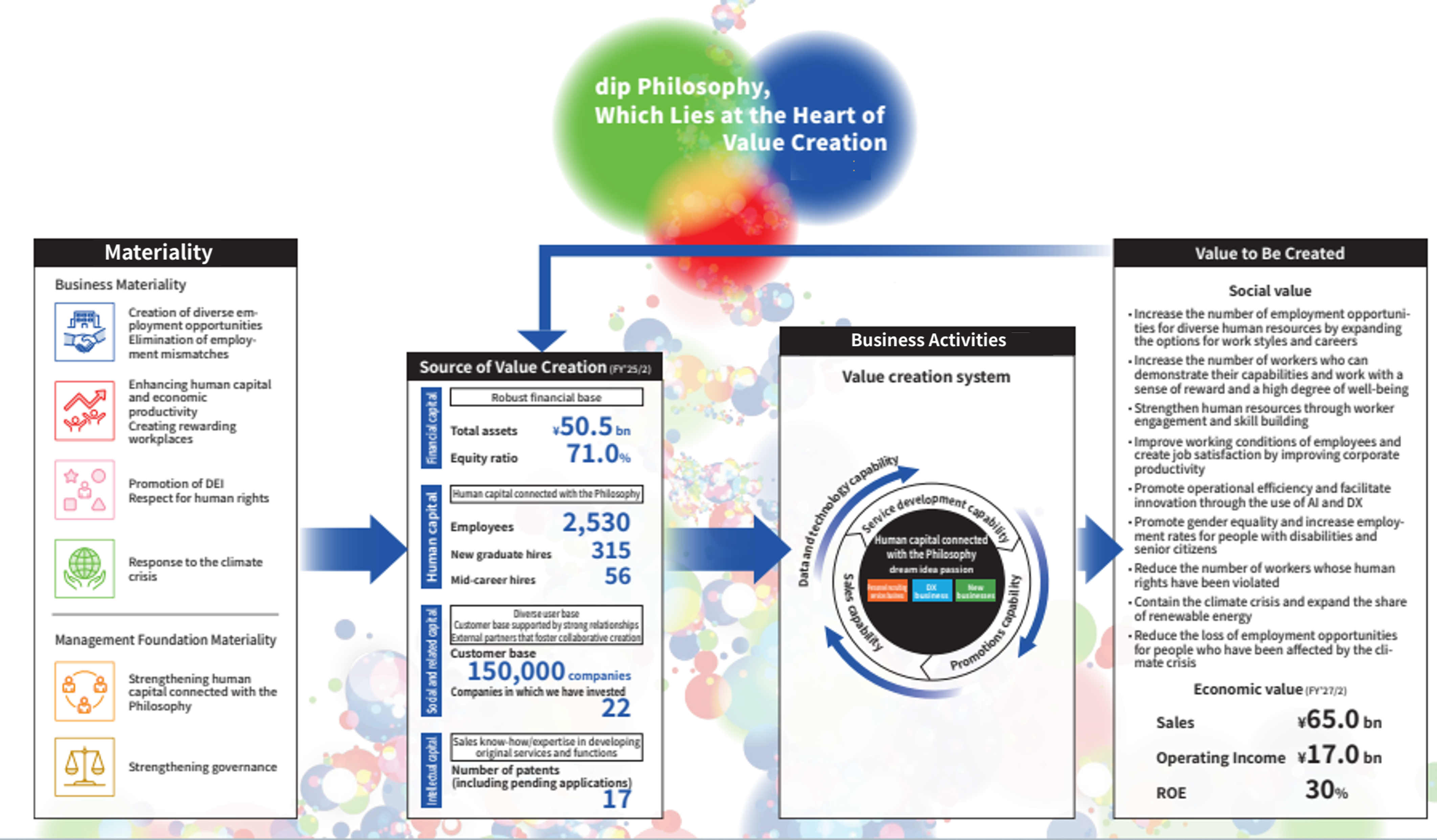 dip's strengths are capabilities in “service development”, “promotions”, and “sales” which are generated by "human capital connected with philosophy”. We are pursuing the improvement of social and economic value by further enhancing these strengths with the power of "data and technology”.