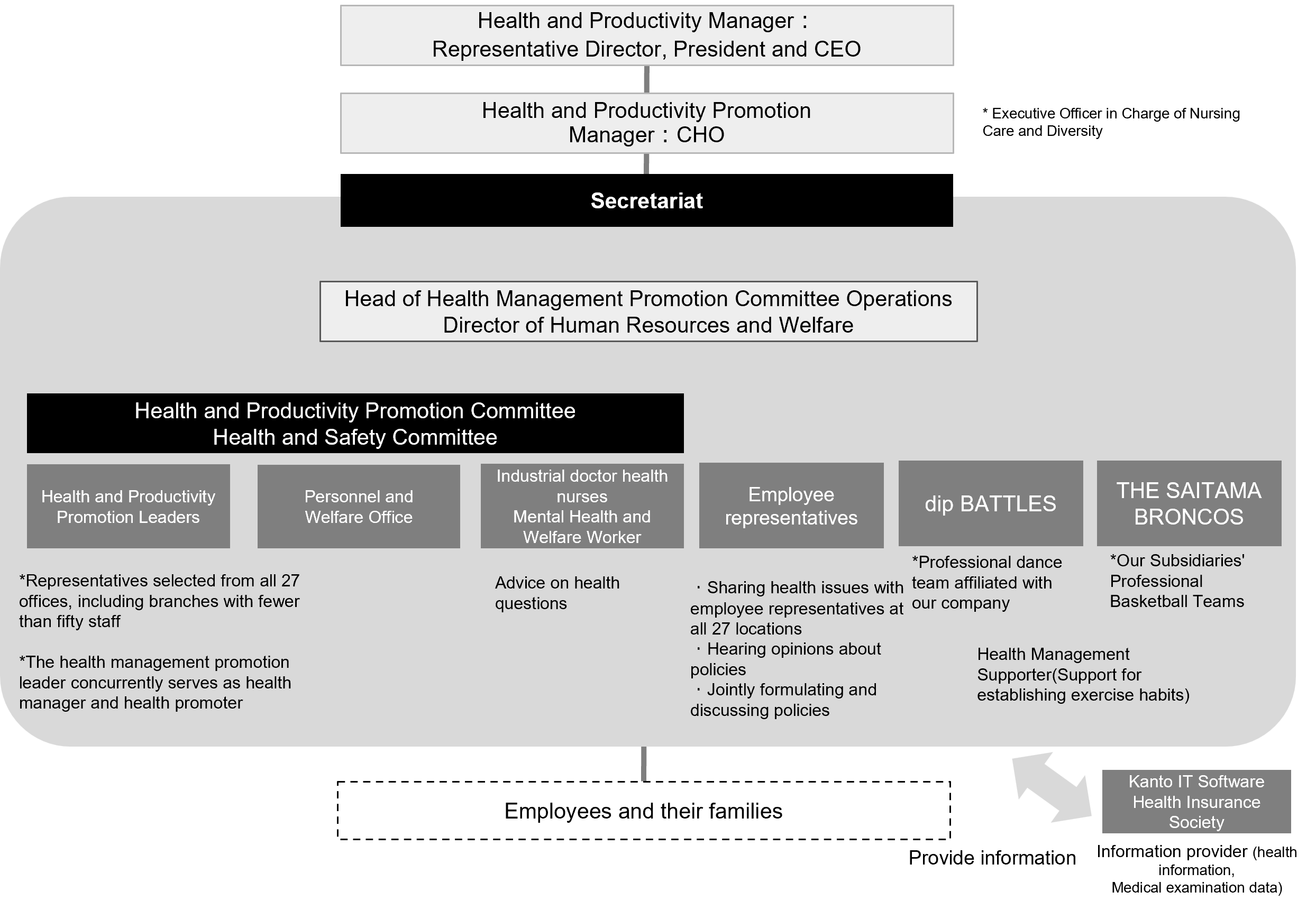 We have established the Health and Productivity Promotion Committee (Operation Manager: Director of Human Resources and Welfare) to promote health and productivity management initiatives, directly under our Representative Director, President and CEO as the Health and Productivity Manager and CHO as the Health and Productivity Promotion Manager. The Board of Directors, Executive Officers Meeting, and other meeting bodies receive reports regularly from this Committee on the content of its discussions. Each office appoints a Health and Productivity Promotion Leader as a member of this Committee to ensure that health and productivity management initiatives reflect opinions from employees.