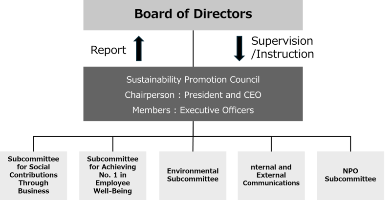 The Sustainability Promotion Council, which conducts quarterly reviews of its progress, formulates strategies and measures based on the sustainability policy and important matters decided by the Board of Directors. In addition, the Board of Directors regularly receives reports from the Sustainability Promotion Council on the content of its discussions and the progress of measures, supervises the progress towards the goals, and gives instructions as necessary.