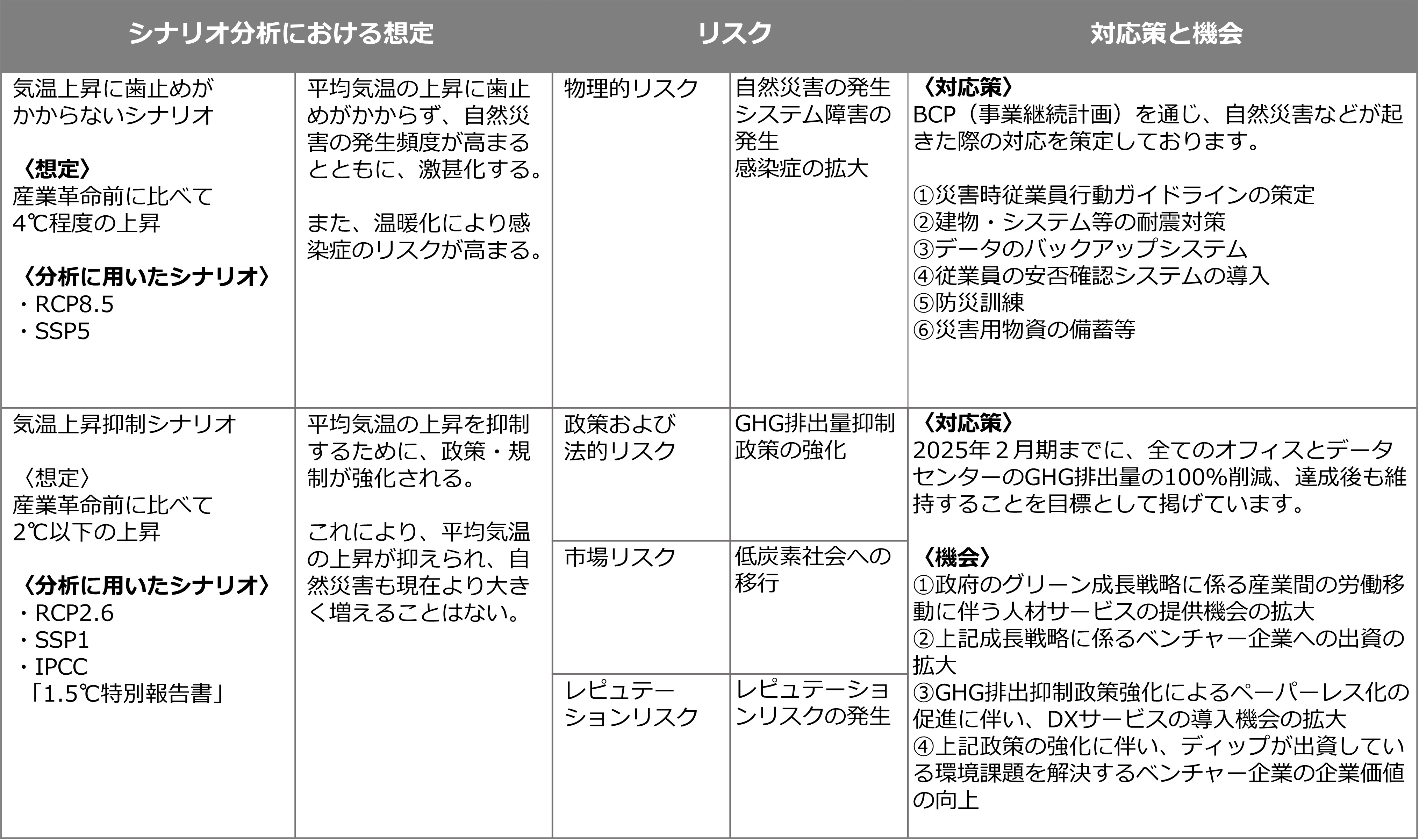 ディップは2021年10月に、TCFD提言への賛同を表明しました。また、同年12月にTCFDが提言する情報開示フレームワーク(気候変動のリスク・機会に関するガバナンス、戦略、リスク管理、指標と目標)に沿った開示をおこないました。今後も開示内容の拡充を検討するとともに、シナリオ分析結果を踏まえて、気候変動に関するガバナンスや事業戦略の更なる強化を目指します。