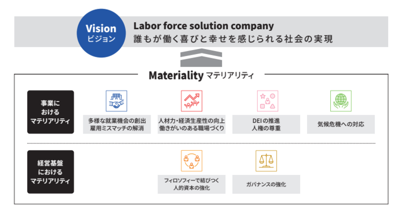 dipは、2023年2月期にマテリアリティを特定しました。以降、国際社会の動向やステークホルダーからのご意見等を踏まえ、継続的に見直しを実施しています。2024年2月期には、日本の労働市場に対するAIなどのテクノロジーの進化がもたらす影響を重要な論点として取り上げ、マテリアリティの見直しを実施しました。その議論では、AIの進化が労働市場構造の変化や雇用機会の創出・喪失、求職者・企業の行動変容、さらに当社の事業運営や提供価値に与える影響などについて検討を行いました。