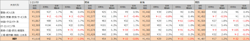 各エリアの平均時給について、関東エリアは1,715円(前年比54円増、前月比10円減)、東海エリアは1,451円(前年比29円増、前月比15円減)、関西エリアは1,487円(前年比17円増、前月比32円減)となりました。