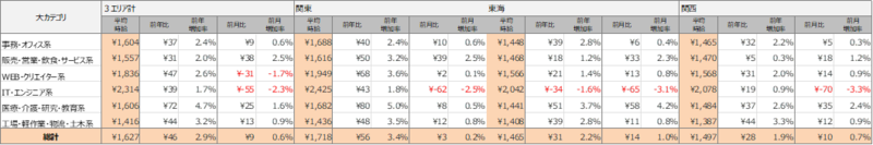 各エリアの平均時給について、関東エリアは1,718円(前年比56円増、前月比3円増)、東海エリアは1,465円(前年比31円増、前月比14円増)、関西エリアは1,497円(前年比28円増、前月比10円増)となりました。