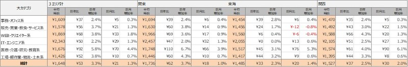 各エリアの平均時給について、関東エリアは1,736円(前年比62円増、前月比18円増)、東海エリアは1,485円(前年比33円増、前月比20円増)、関西エリアは1,527円(前年比37円増、前月比30円増)となりました。