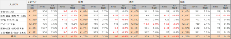 各エリアの平均時給について、関東エリアは1,729円(前年比55円増、前月比7円減)、東海エリアは1,472円(前年比39円増、前月比13円減)、関西エリアは1,529円(前年比63円増、前月比2円増)となりました。