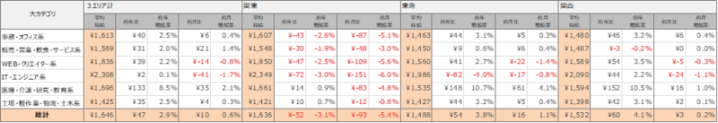 各エリアの平均時給について、関東エリアは1,636円(前年比52円減、前月比93円減)、東海エリアは1,488円(前年比54円増、前月比16円増)、関西エリアは1,532円(前年比60円増、前月比3円増)となりました。