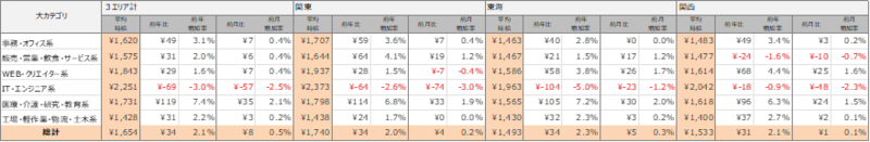 各エリアの平均時給について、関東エリアは1,740円(前年比34円増、前月比4円増)、東海エリアは1,493円(前年比34円増、前月比5円増)、関西エリアは1,533円(前年比31円増、前月比1円増)となりました。