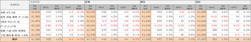 各エリアの平均時給について、関東エリアは1,734円(前年比19円増、前月比6円減)、東海エリアは1,509円(前年比33円増、前月比16円増)、関西エリアは1,535円(前年比23円増、前月比2円増)となりました。